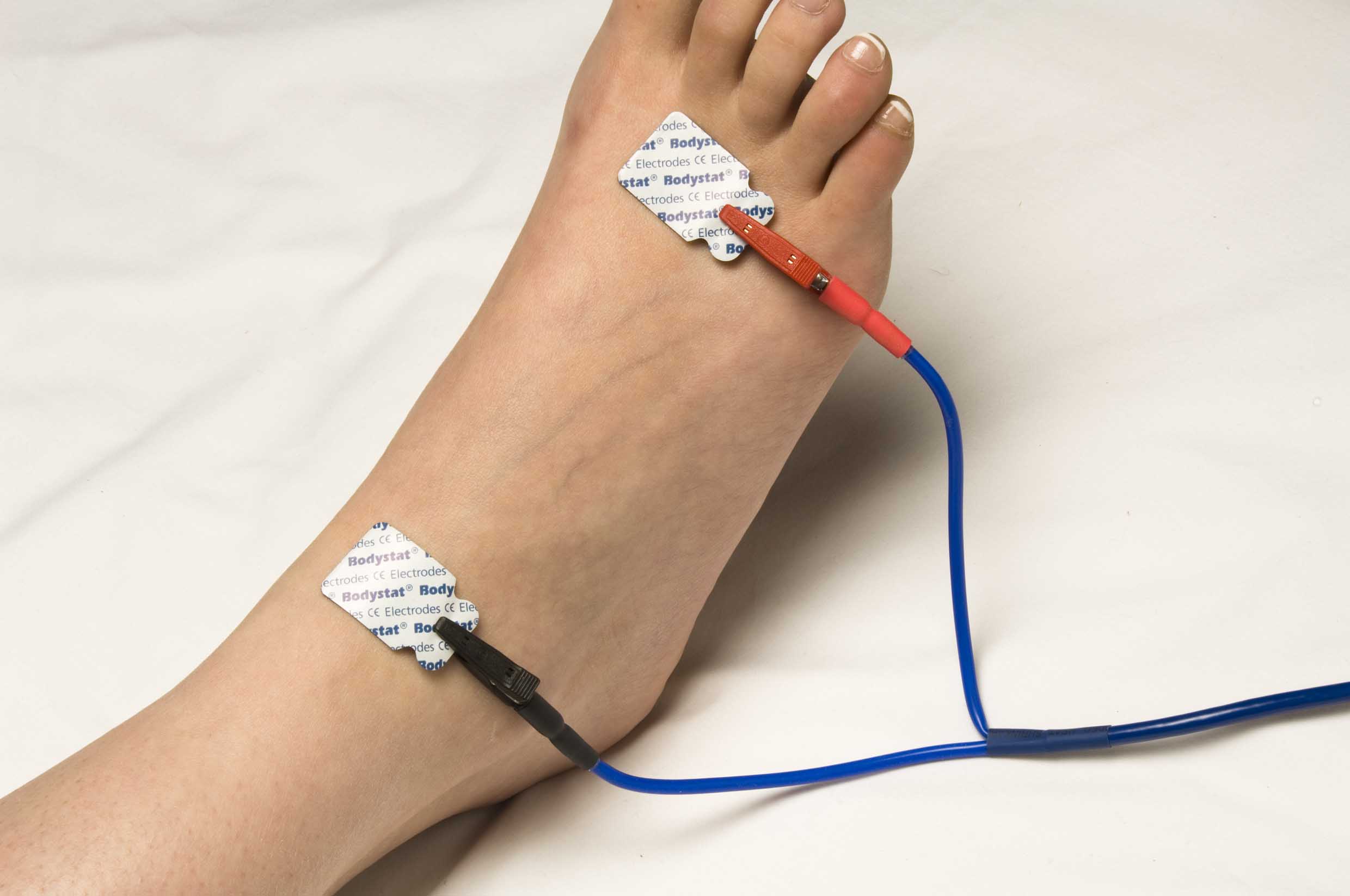 In order to ensure that the results are accurate when they are repeated it is important to make sure that the electrodes are placed in exactly the same place as they were for the previous test. Two electrodes are placed on the foot and the hand as illustrated below. In order to obtain accurate data you must follow the instructions on test protocol. Electrodes should be re-used and must not be cut in half.