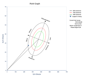 The BIVA graph plots the resistance and reactance at a fixed frequency of 50 kHz on an RXc Graph. The position of the dot reflects the subject’s health status in comparison against a selected population group.